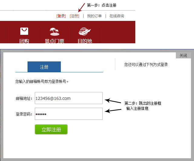 在网站右上角点击 [注册] ,弹出一个注册框,填入邮箱地址、登陆密码及可注册成功。步骤如图所示: