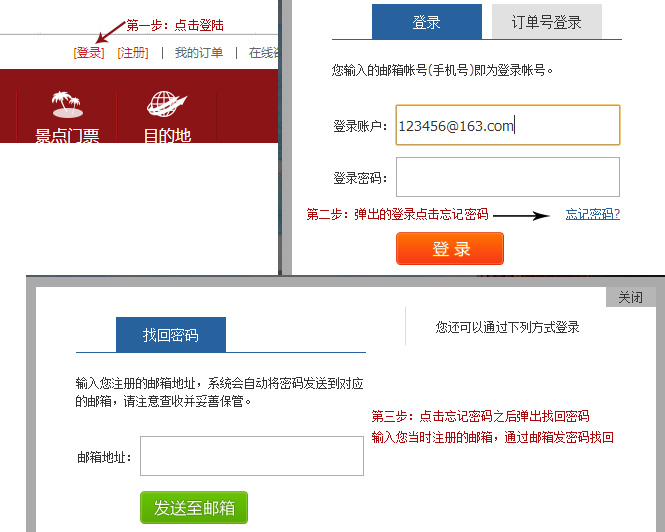 在网站右上角点击 [登陆] ,弹出一个登陆框,在登陆框右下角点击“忘记密码” 在弹出的找回密码框输入您当时注册时的邮箱,通过发送密码到您的邮箱找回密码。步骤如图所示:
