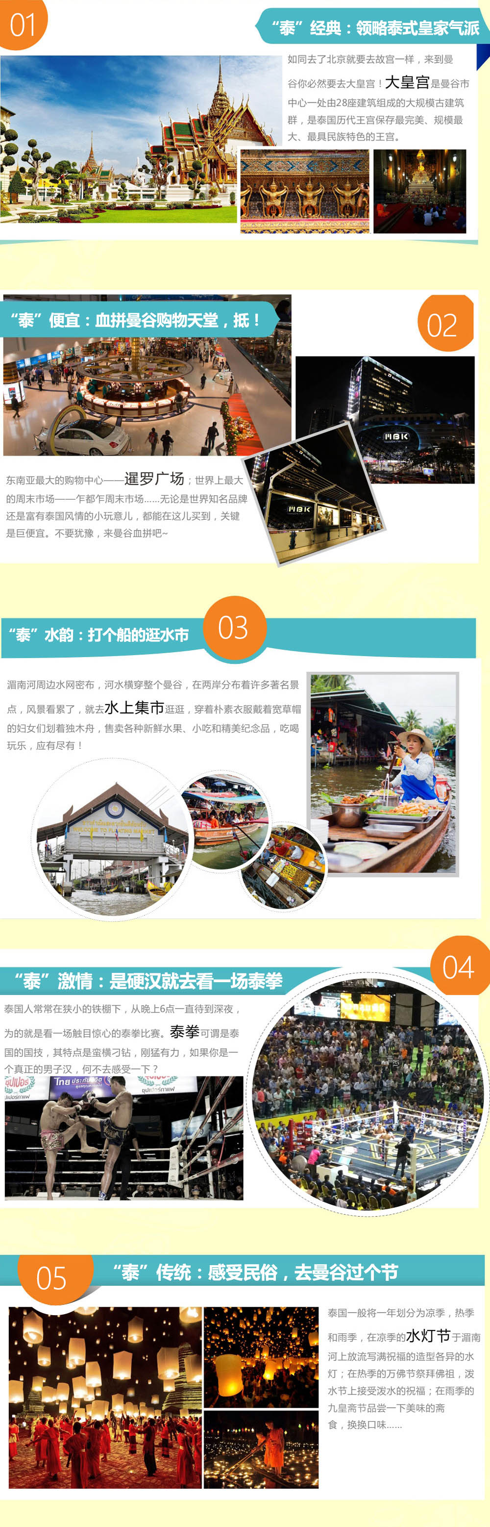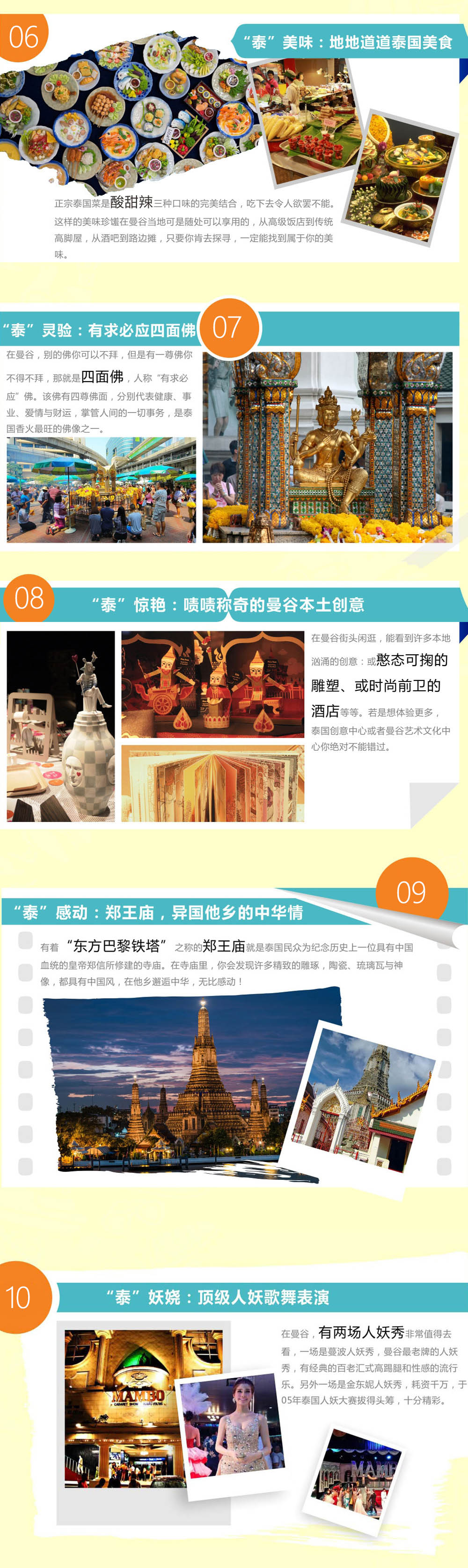 这里优美迷人的热带风光也许及不上马尔代夫的惊艳,广博的佛教文化似乎也不如印度的狂热,独有的民间风俗又比不上缅甸的纯粹,但泰国却蜚声海外,吸引着世界各地的游客前来观光。而泰国的致命吸引力或许正是以上三者的叠加,加上东西方文化的完美融合、古代和现代化的时空交错,让你慢慢体会精致而又真切泰国生活。泰国是亚洲重要的旅游国家之一,泰国(Thailand)适合作为东南亚旅行的第一站,总是热情地欢迎来自世界各地的旅行者。泰国有美食、海滩和热情的人民,再加上东南亚最成熟优秀的旅游服务,还有什么理由不去泰国呢?从曼谷这座现代化的城市出发,往北是大城、素可泰和清迈等一系列可以安静悠闲享受生活的古城,往南则是芭提雅、普吉岛、苏梅岛、涛岛等等遍布的海滩,可以满足你对热带海洋的一切想象。